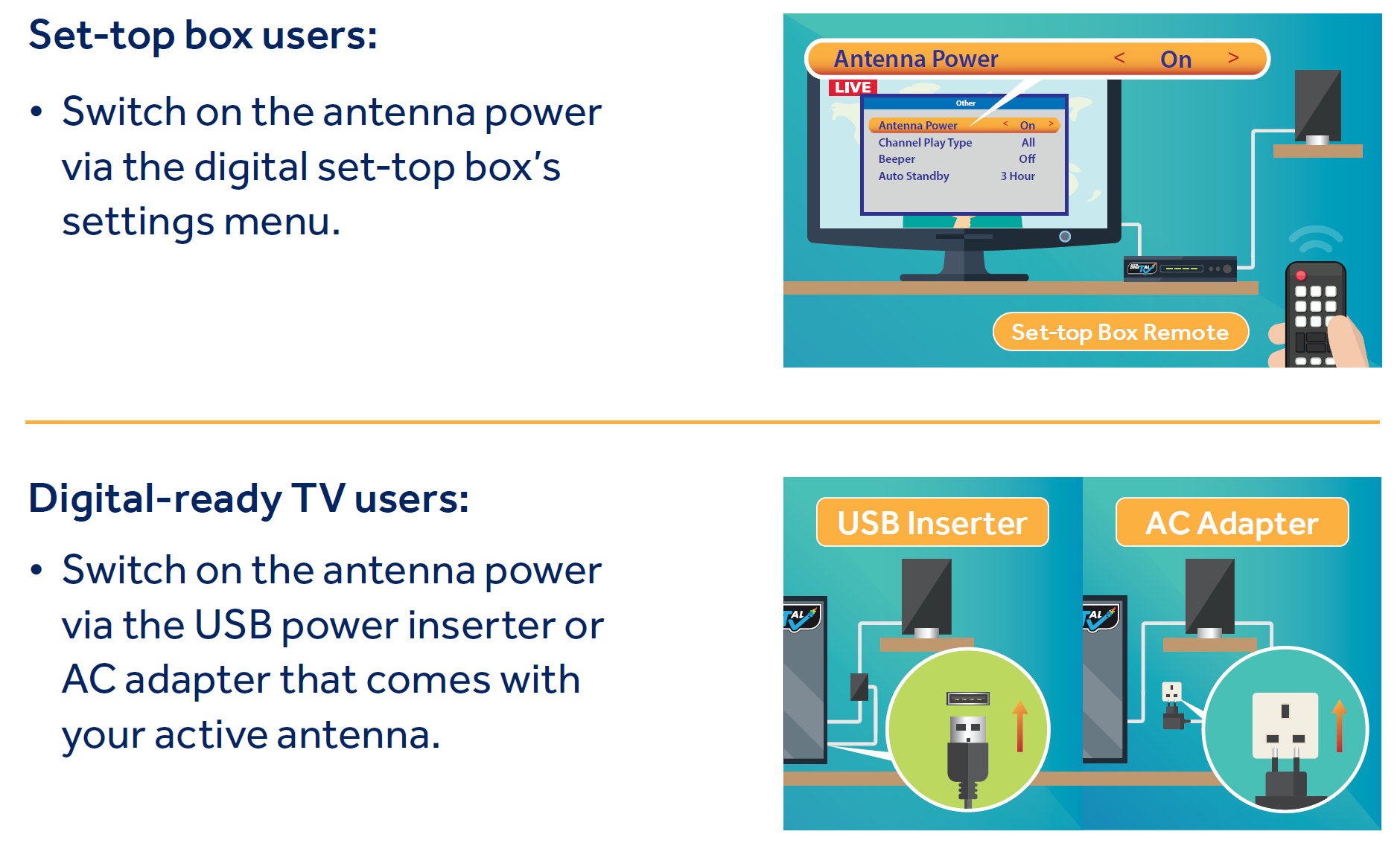 - Remember to switch on the antenna power via the digital set-top box's settings menu.