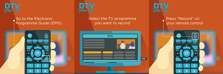 To record shows, you will need to connect a storage device (e.g. thumb drive or portable hard disk) to your set-top box or IDTV’s USB port. Select the programme you will like to record via the electronic programme guide, then press the “record” option/symbol on your digital set-top box or IDTV’s remote control to schedule the recording. If your TV does not have digital recording functions, you may wish to purchase a digital set-top box with built-in recording functions.