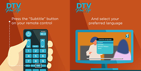 Press the 'subtitle' option on your digital set-top box or IDTV’s remote control to select your preferred subtitle language. Most digital set-top boxes or IDTVs also allow you to pre-set your preferred primary and secondary subtitle languages. These are usually set in the system settings menus. Click here for the guide on enabling and selecting subtitles.